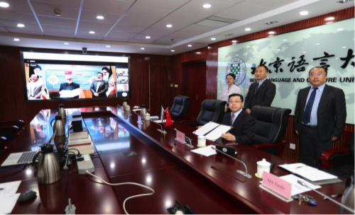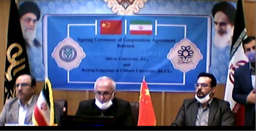北京时间7月20日下午,北京语言大学刘利校长应邀与伊朗设拉子大学视频连线,双方就两校间学术合作、校际交流等方面进行商谈,并签署两校科研文化及教育合作协议。伊朗伊斯兰共和国驻华大使凯沙瓦尔兹·扎德先生、文化教育参赞瓦法伊先生出席会谈并发表讲话。