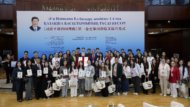 首发式上,中哈嘉宾共同为《习近平谈治国理政》第一卷至第四卷哈文版新书揭幕,中方向哈方赠送了新书,两国专家学者围绕中哈治国理政经验进行了交流研讨。