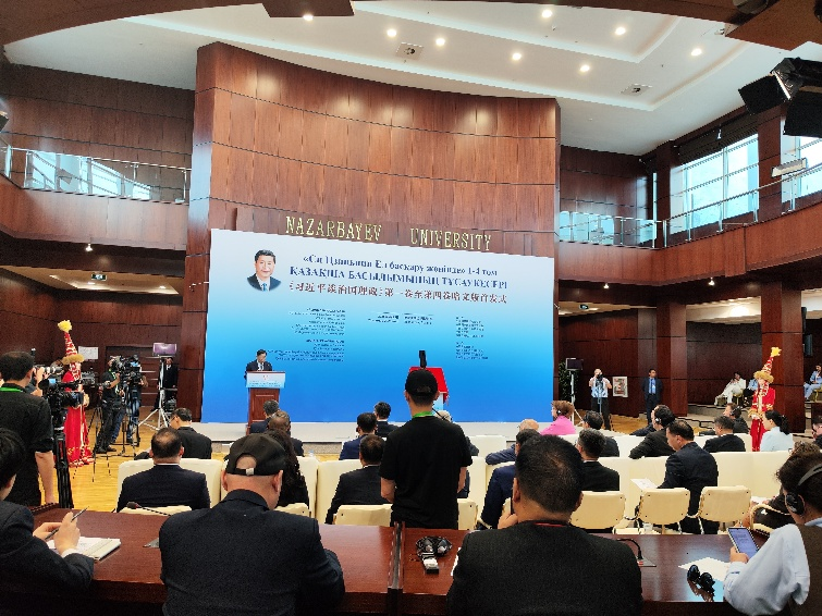 中共中央宣传部分管日常工作的副部长胡和平、哈萨克斯坦文化和信息部部长阿依达•巴拉耶娃、中国国家民族事务委员会副主任郭卫平、中国外文局局长杜占元、中国驻哈萨克斯坦大使韩春霖到会致辞,北京语言大学哈萨克斯坦分校联合创办者、阿斯塔纳国际大学校长谢里克•伊萨里耶夫、哈萨克斯坦中国研究中心主任古丽娜尔•沙伊梅尔格诺娃、哈萨克斯坦法兰特集团总经理努尔兰•伊萨别阔夫、中国社会科学院俄罗斯东欧中亚研究所副所长庞大鹏做大会交流发言。中哈两国政党、媒体、智库及高校等各界代表约300人出席,北语哈萨克斯坦分校组织了200余名师生参加了首发式。
