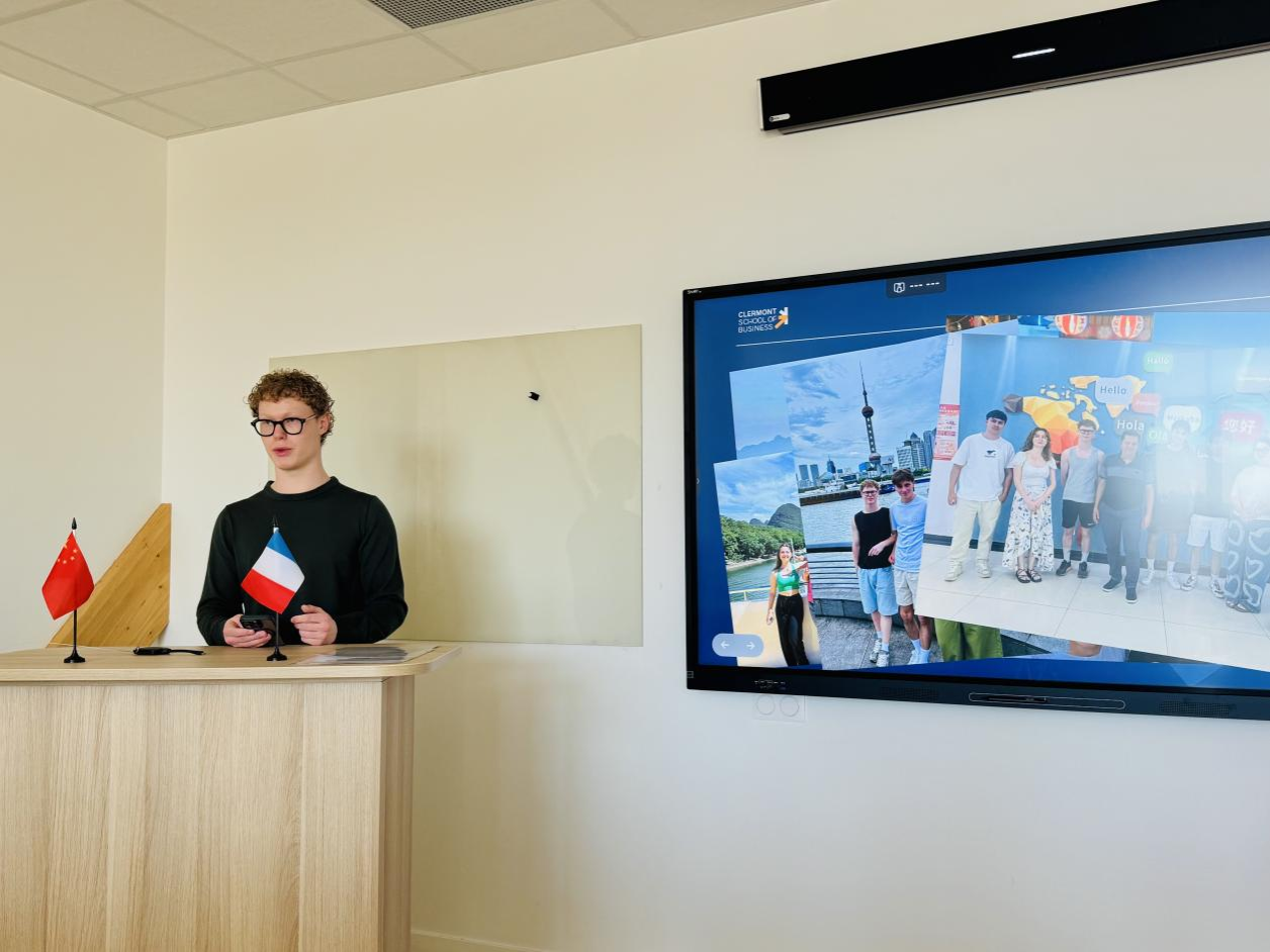 曾在我校留学的克莱蒙商学院学生代表分享了自己在北语的学习经历。他表示,在短短三个月的时间里,他不仅领略了中国丰富多彩的文化,还结识了许多朋友。