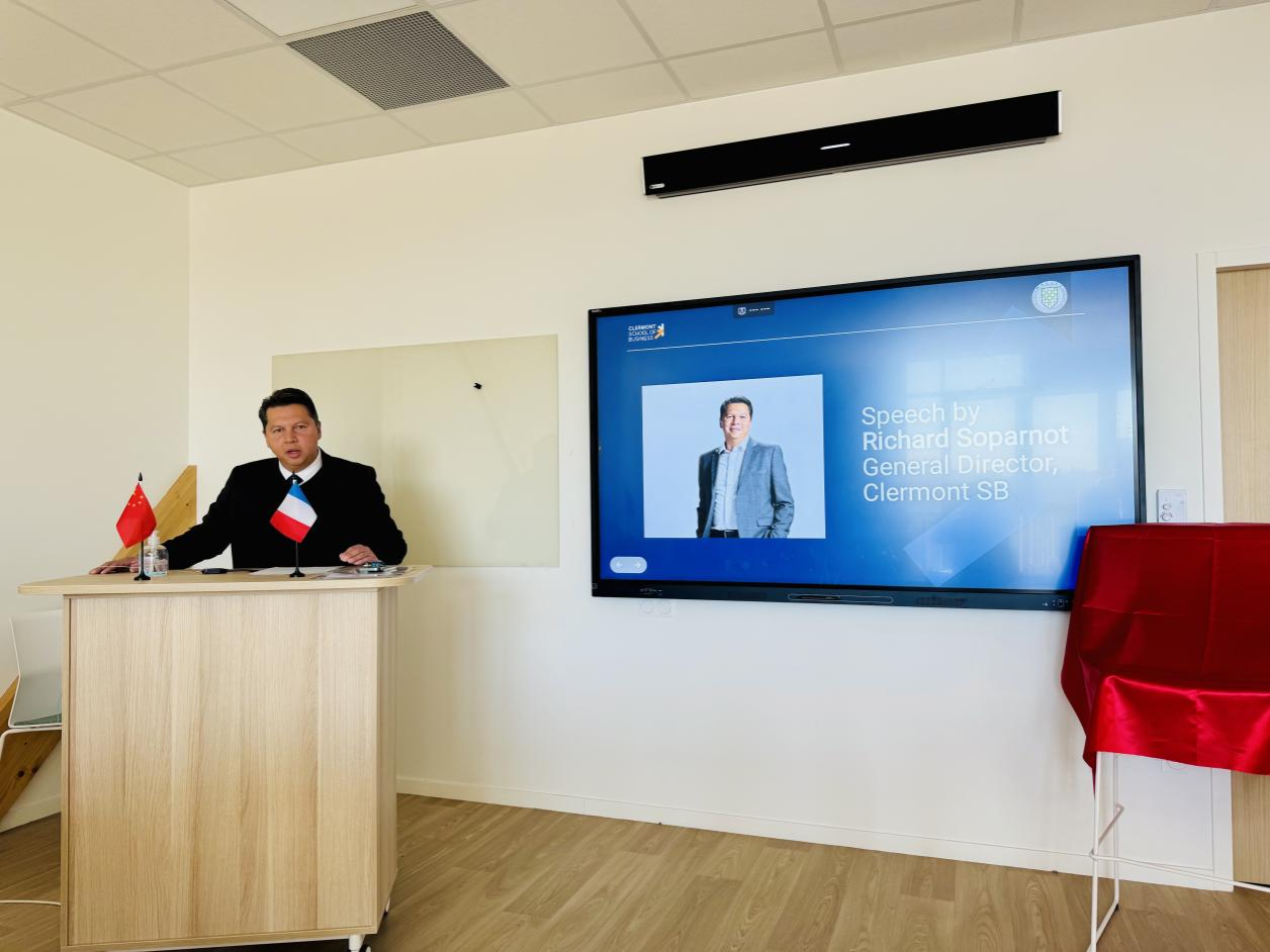 克莱蒙高等商学院校长理查德·索巴诺在致辞中欢迎北语代表团的到来,并回顾了双方自2018年建立合作关系以来的丰硕成果。他特别提到,2022年双方签署互设校区协议,克莱蒙北京语言大学校区于2023年年底在北京正式揭牌,进一步优化了合作模式。未来,克莱蒙高等商学院将继续派遣学生前往北语进行长期或短期学习,并将持续推进和完善在海南申办中外合作办学机构的计划。他提到,这是双方七年来深厚合作的结晶,北京语言大学是克莱蒙高等商学院合作最为深入的高校。他对北语表达了由衷感谢,并期待未来在更多领域携手共进。