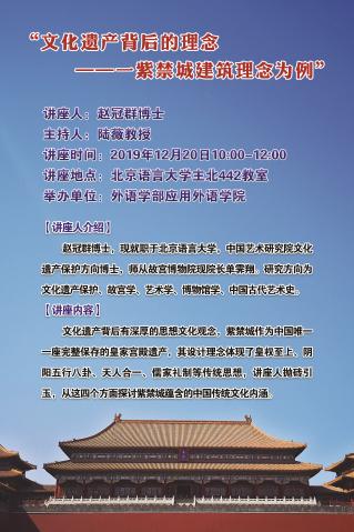 2019年12月20日,外语学部应用外语学院在主楼北442教室举办了文化遗产发展系列讲座(一)——“文化遗产保护与紫禁城建筑风格的传统理念”。此次讲座的主讲人为北京语言大学的赵冠群博士。讲座由应用外语学院院长陆薇教授主持,人文社科学部张强教授出席了讲座。2019级文化遗产发展、英语语言文学、意大利语以及其他专业的研究生、本科生数十人听取了此次讲座。