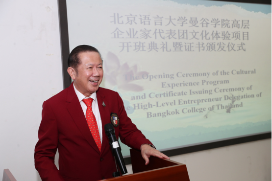 泰国曼谷学院理事长洪百川先生首先对北语热情的接待表示感谢,感谢张宝钧副校长百忙中参加此次开学典礼。他介绍了高层企业家培训班的情况,学员们都是在泰国很有影响的企业家,他们在曼谷学院学习一学期,除了学习汉语,也学习历史、文化、经济,来北语访问和学习也是课程的一部分。代表团昨天访问了京东和泰国驻华大使馆,了解了中国的发展情况,相信他们回到泰国后会为中泰友好关系做出贡献。