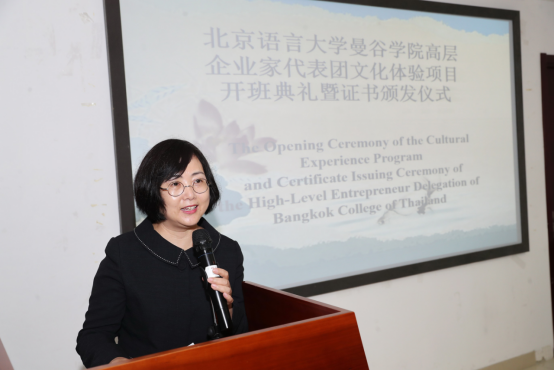 汉语速成学院院长苏英霞介绍了汉语速成学院的历史、现状以及教学模式等情况。速成学院成立40多年来,已为世界100多个国家和地区培养短期来华留学生超过10余万人次,泰国一直是学院主要的生源国,前副总理THEPKANJANA PHONGTHEP(王蓬贴)、泰国前能源部部长KASEMTHONGSRI VICHET(林星翰)等政要都曾在速成学院学习。“短期速成强化”教学模式在全球汉语国际教育,特别是短期强化教学领域占有重要地位,发挥着骨干和引领作用。这次学员们在速成学院只学习两天,是“短期”中的“短期”,学院与中华文化国际传播中心共同为各位量身定制了两天的课程和文化活动,组织了优秀的教学团队,大家可以在这短短的两天中亲身感受一下我们的速度和效率,所谓“百闻不如一见”。