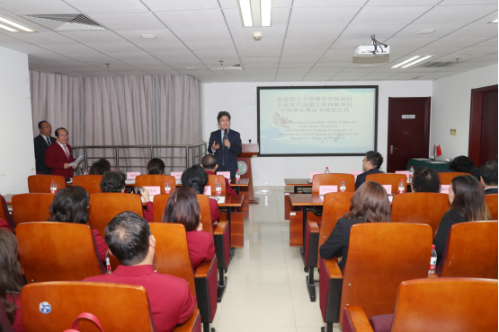 张宝钧副校长参加了泰国曼谷学院高层企业家代表团文化体验项目开班典礼暨证书颁发仪式。他首先欢迎代表团访问北语,介绍了北语的历史、办学特色、孔子学院、外派教师、汉语国际教育现状等情况。他作为曼谷学院的创始人之一,见证了十六年来曼谷学院培养了几百名本科生和硕士生,为泰国培养了大批汉语人才。他说,各位学员不管是在北语学习,还是泰国曼谷学院学习,只要学习一天,就都是北语的校友,随时欢迎各位来北语访问或学习,希望学员们在北语学习的两天,亲身感受汉语、中华文化的魅力,成为中泰友好交流的纽带和桥梁。