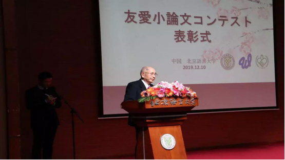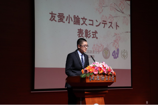 随后,友爱协会、中国国际青年交流中心以及北京语言大学的领导共同颁发了“友爱”作文一、二、三等奖。获得一等奖的16级日英专业复语专业任耐安发表了获奖感言。任耐安同学阐述了自己对于“友爱”的“自立与共生”精神的理解,也表达了自己愿意秉持“友爱精神“,为今后的中日友好作出贡献的决心。