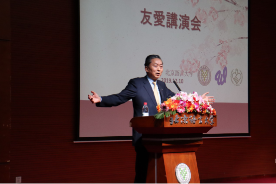 12月10日,日本前首相、日本友爱协会理事长鸠山由纪夫先生携夫人带领日本公益法人友爱协会来我校访问。北京语言大学党委书记倪海东书记致欢迎辞。