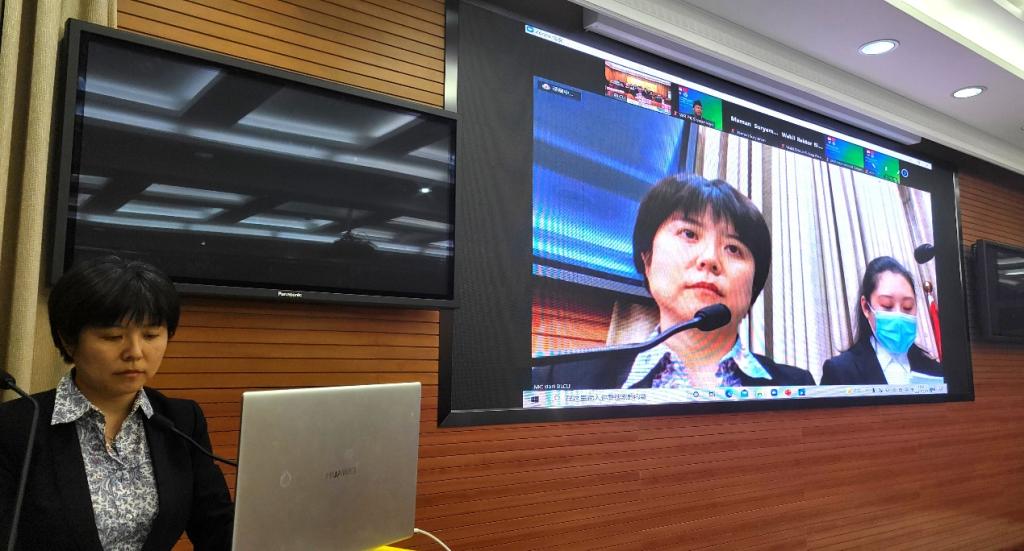 杨峻院长在签约仪式上致辞。杨院长向印尼日惹国立大学的与会嘉宾们简要介绍了北京语言大学外国语学部东方语言文化学院的基本情况。她分别从我院的日、韩及印尼语三个语系介绍了其学科专业的优异表现。最后,杨院长向印尼日惹国立大学发出诚挚的邀请:希望在疫情过去后,印尼日惹国立大学的领导老师们能到我校进行线下交流合作。