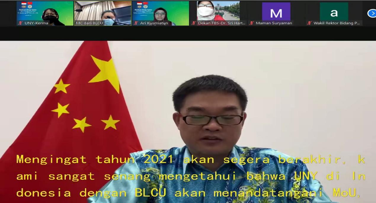 此次活动收到了中国驻印尼泗水总领事顾景奇先生发来的祝贺视频。在视频中,顾总领事代表中国驻泗水总领事馆对北京语言大学与印尼日惹国立大学建立友好合作关系表示衷心的祝贺。顾总领事提到,日惹国立大学是各国印尼语专业留学生的青睐之所,也为中国培养了许多印尼语专业人才。而北京语言大学是以来华留学生国际中文教育为基础、多国外语并驾齐驱的著名学府,素有“小联合国”的美誉。双方院校的合作是顺势而为,响应时代所需,希望两校能以此为契机,在MoU框架下不断深化合作,共同为培养中印尼友好交流的使者而努力奋斗。