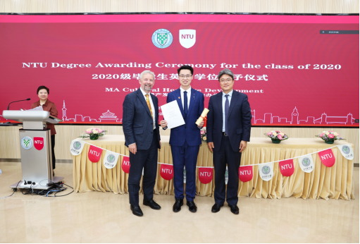 2023年5月12日下午,我校与英国诺丁汉特伦特大学共同举办的“文化遗产发展”中外合作办学项目2023届英方毕业典礼暨学位授予仪式在教二楼101教室隆重举行。中、英双方校领导、项目导师与任课教师、我校研究生院、国际合作与交流处代表等出席典礼。接受此次学位授予的2023届毕业生是文化遗产发展项目的第二批毕业生,也是疫情结束后第一批在线下接受英方授予学位的毕业生,举办此次学位授予仪式对于两校和项目学生都具有重要意义。