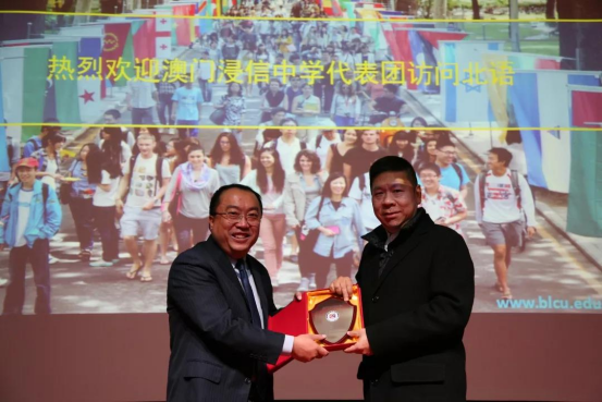 马铁石主任与澳门浸信中学李焯坚校长互赠礼物并合影留念。欢迎仪式结束后,代表团师生在北语澳门学生志愿者的带领下参观北语的教学及生活设施,深入了解北语校园环境。