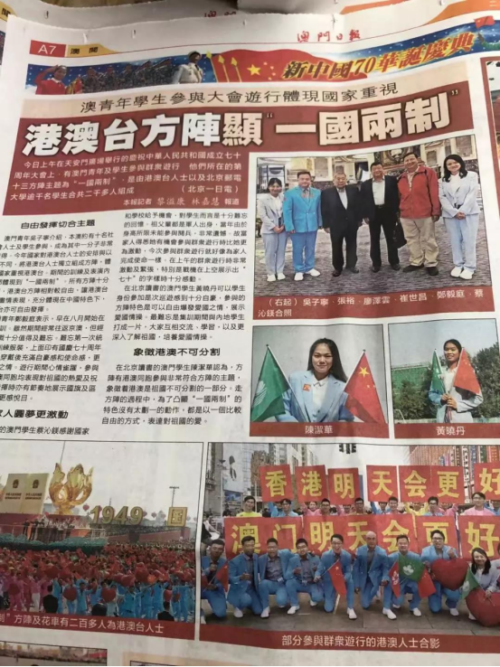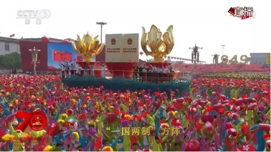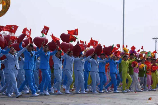 10月1日,由港澳台同胞和各界群众组成的“一国两制”方阵在天安门前接受祖国检阅。北语师生手执国旗、香港特区区旗、澳门特区区旗和红色心形道具,伴随着歌曲《我属于中国》,高喊“祖国我爱你”走过天安门广场,为祖国70华诞献上最赤诚最热烈的祝福,共祝香港和澳门明天更美好。