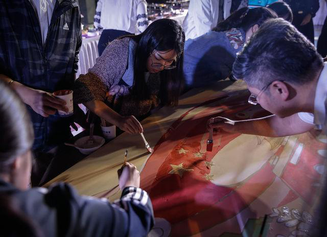 9月12日,北京未来科学城,学生们在一幅漆画上填色。画中有国旗、两岸三地地标、鲜花等元素,以“龙的传人 祝福新中国70华诞”为主题。中国青年报·中国青年网记者 李峥苨/摄